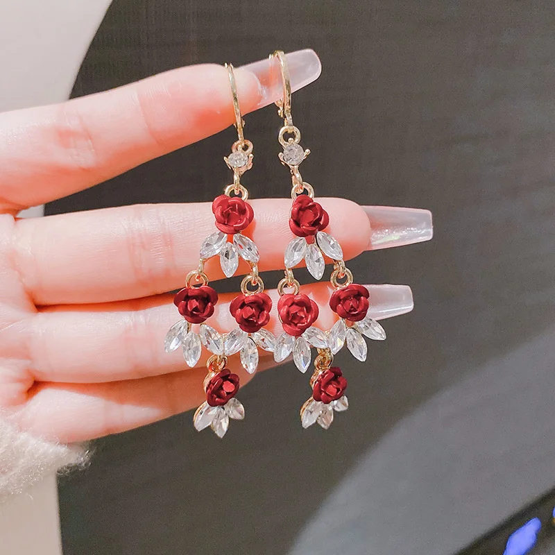 Fashion Red Zircon Long Tassel Earrings for Women Elegant Rose Crystal Pendant Earrings Girls Party Wedding Statement Jewelry